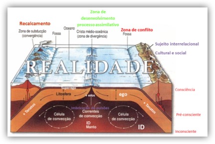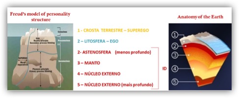 Recordando o modelo freudiano do Iceberg, a crosta terrestre representaria o Superego, a Litosfera corresponderia ao Ego e a Astenosfera, o manto inferior e o núcleo ao ID. O dinamismo tectónico movimentaria Ego e Superego entre a superfície e o interior, conferindo-lhes a plasticidade de poderem funcionar aos três níveis de profundidade – consciência, pré-consciente e inconsciente –, enquanto o ID se manteria sempre ao nível inconsciente, aumentando a inacessibilidade com a profundidade.