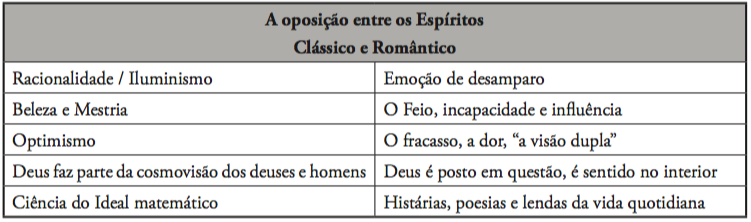 Numa tabela dá‑se uma visão esquemática da diferença do espírito entre a época clássica de Kant, Goethe e Schiller e o espírito romântico.